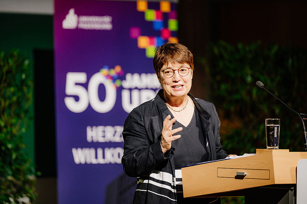 Zu den Gratulierenden gehörte unter anderem die Ministerin für Kultur und Wissenschaft des Landes Nordrhein-Westfalen Isabel Pfeiffer-Poensgen. „Universitäten sind von entscheidender Bedeutung für die wissenschaftliche, wirtschaftliche, soziale und kulturelle Entwicklung unseres Landes – so auch die Universität Paderborn. Sie hat sich seit ihrer Gründung vor 50 Jahren von der einstigen Gesamthochschule zu einer forschungsstarken und zukunftsorientierten Universität entwickelt. Besonders wichtig dabei sind die positive Entwicklung der Studierendenzahlen, die Entwicklung von fünf fakultätsübergreifenden Profilbereichen und zahlreiche Erfolge im Transfer in die Praxis sowie in der Internationalisierung“, so Ministerin Pfeiffer-Poensgen. Die Universität sei außerdem eine wichtige Partnerin für das Land NRW in der Ausbildung von Lehrkräften, hob sie mit Blick auf das Paderborner Zentrum für Bildungsforschung und Lehrerbildung – PLAZ-Professional School hervor.