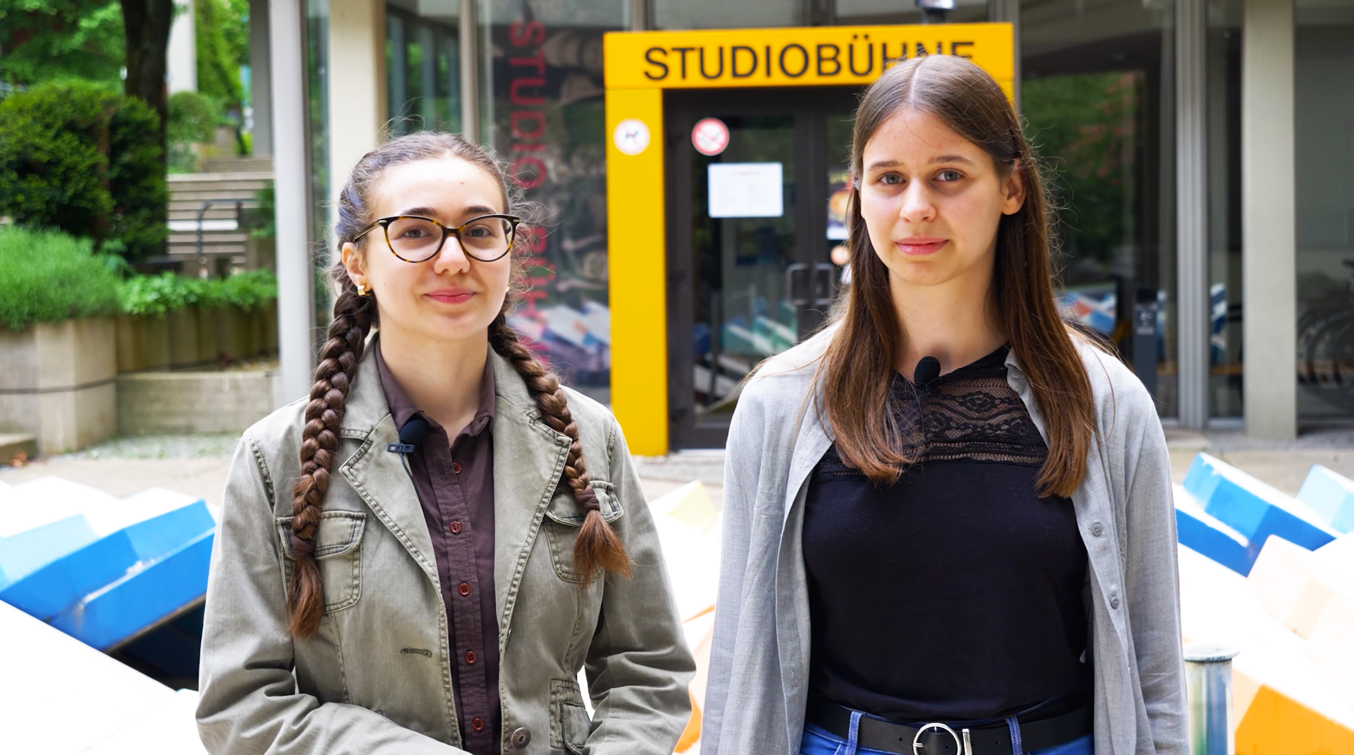 Foto (Universität Paderborn, Blickfang): Denise Socaciu (links) und Antonia Gäbel (rechts) moderieren auf dem Campus.