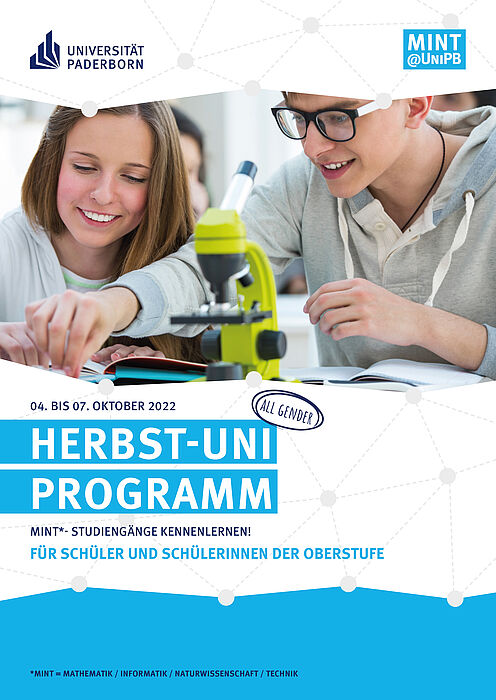 In den Herbstferien findet an der Universität Paderborn vom 4. bis 7. Oktober ein MINT-Schnupperstudium mit spannenden Vorlesungen und eindrucksvollen Workshops aus den Bereichen Mathematik, Informatik, Naturwissenschaften und Technik statt. Die Teilnahme ist kostenlos. Eine Anmeldung ist noch bis zum 18. September möglich. Alle Informationen zum Programm für Schüler*innen der Oberstufe sowie Anmeldemöglichkeiten gibt es auf der Webseite der Herbst-Uni „all gender“. Exklusiv für Mädchen wird wieder die Herbst-Uni „girls only“ angeboten, Anmeldungen dafür sind auf der Webseite der Herbst-Uni „girls only“ möglich.