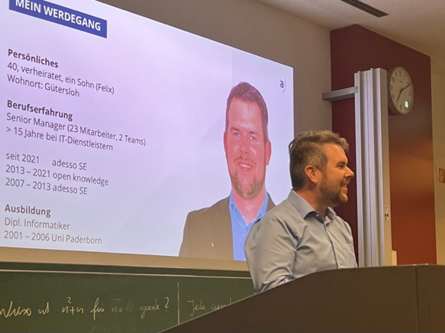 Am Donnerstag, 27.Oktober fand ein Doppel-Vortrag der Reihe "Berufsbilder der Mathematik und Informatik" des Ehemaligenvereins Die Matiker e.V. an der Universität Paderborn statt. Melanie Bruns von PSI Logistics und Stephan Müller von adesso SE am Standort Paderborn, beide Absolventen der Universität und Mitglieder der Matiker, spannten in ihren Vorträgen den Bogen von ihrem Studium zu ihrem jetzigen Berufsumfeld. Durch viele Anekdoten und ehrliche Eindrücke konnten die Vortragenden Tipps für den weiteren Berufsweg anschaulich vermitteln.