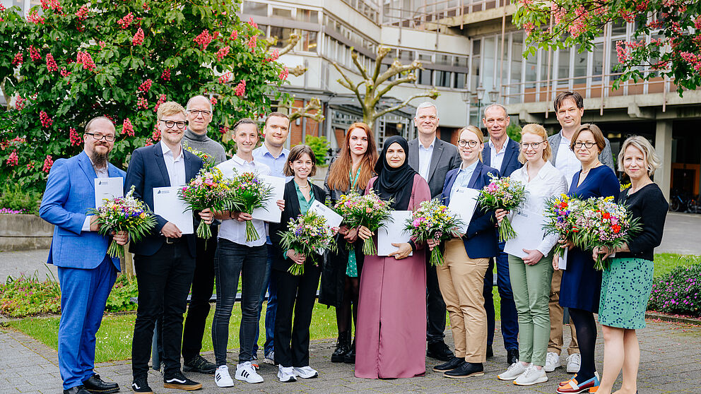 Foto (Universität Paderborn, Besim Mazhiqi): Für ihre Innovativen Lehrkonzepte, besonderes Engagement in der Betreuung von Studierenden und herausragende Promotionsvorhaben zeichnete das Präsidium 16 Wissenschaftler*innen mit Preisen und Stipendien aus. 13 von ihnen nahmen ihre Urkunden und Glückwünsche persönlich entgegen.
