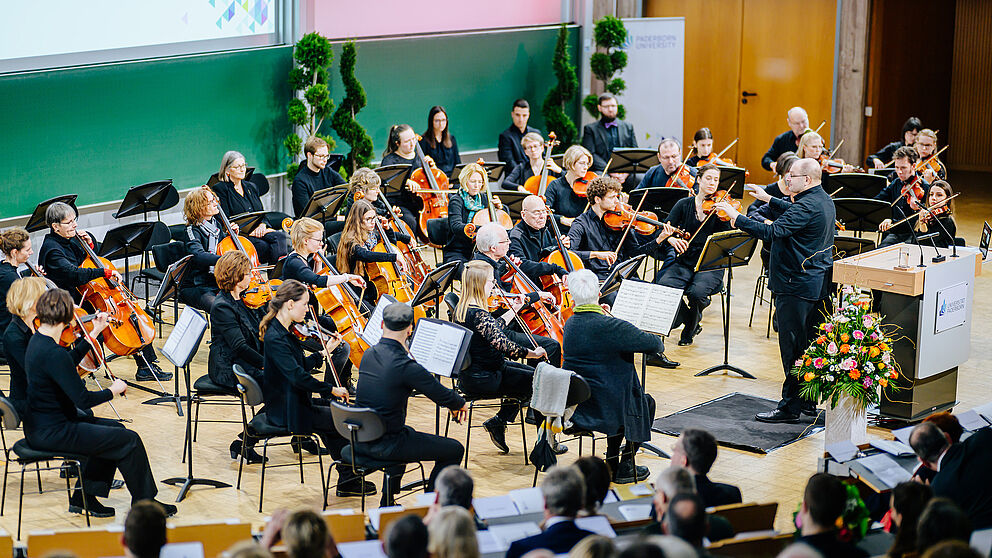 Mit dem Hochschulorchester, Preisverleihungen und rund 400 Gästen aus Wissenschaft, Wirtschaft und Politik hat die Universität Paderborn am Sonntag, 21. Januar, den traditionellen Neujahrsempfang gefeiert. Prof. Dr. Birgitt Riegraf blickte im Auditorium maximum auf das vergangene Jahr zurück und nutzte den Anlass, um ihre Amtszeit als Universitätspräsidentin Revue passieren zu lassen.