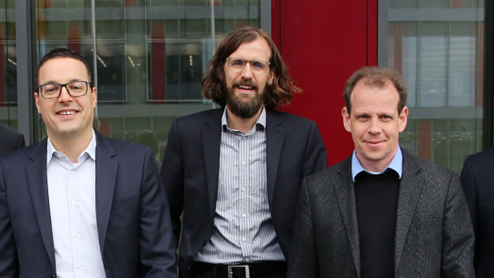 Foto (Universität Paderborn, Besim Mazhiqi): V.l.n.r. Prof. Dr. Daniel Beverungen, Prof. Dr. Dennis Kundisch, Prof. Dr. Oliver Müller, Prof. Dr. Guido Schryen und Prof. Dr. Matthias Trier.