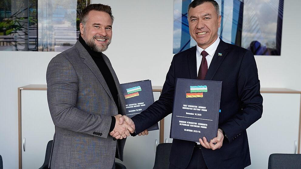 Foto (Universität Paderborn, Selina Härtel): Prof. Dr. Matthias Bauer (links) und Prof. Dr. Ilkhomjon Tukhtasinov bei der Unterzeichnung des „Memorandum of Understanding“.