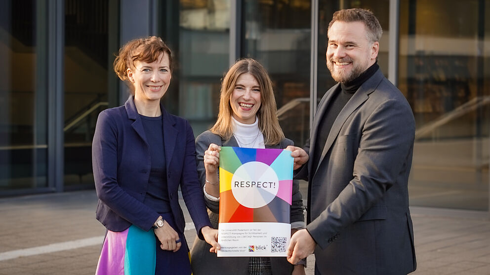 Foto (Universität Paderborn, Johanna Pietsch): (v. l.) Dr. Annika Hegemann, zentrale Gleichstellungsbeauftragte, Laura Maring, Referentin für Diversity, und Prof. Dr. Matthias Bauer, Präsident der Universität Paderborn, präsentieren das Plakat, mit dem die Universität ab sofort sichtbar Teil der „RESPECT!-Kampagne“ ist.