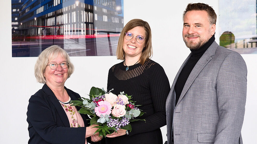 Foto (Universität Paderborn, Johannes Schnurr): (v.l.n.r.) Simone Probst, Vizepräsidentin für Wirtschafts- und Personalverwaltung, Anna Nickel, neue Leiterin der Universitätsbibliothek, und Universitätspräsident Prof. Dr. Matthias Bauer.