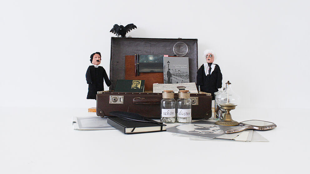 Foto (Universität Paderborn, Lisa Rempe/Larissa Eikermann): Der Museumskoffer zum Thema „Der Einfluss Edgar Allan Poes auf die Werke von Léon Spilliaert – ‚Licht und Schatten, schön und grotesk‘“ von Tilman Storch.