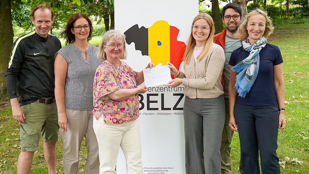 Foto (Universität Paderborn, Stephan Risse): (v. l.) Dennis Kehne, Leiter Studentisches Gesundheitsmanagement (SGM), Sandra Bischof, Koordinatorin Betriebliches Gesundheitsmanagement, Simone Probst, Vizepräsidentin für Wirtschafts- und Personalverwaltung, Clara Wantzelius, studentisches Mitglied im Benelux-Team des BELZ, Dr. Resul Karaca, Co-Leiter des BelgienNets, und Prof. Dr. Sabine Schmitz, Vorstandsvorsitzende des BELZ, bei der Spendenübergabe.