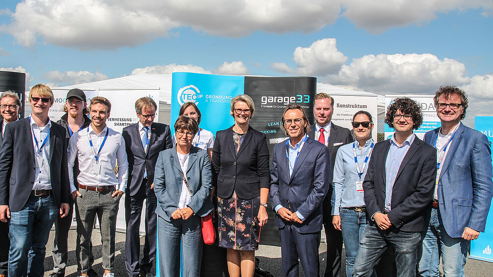 Foto (Universität Paderborn, Kamil Glabica): Bundesbildungsministerin Anja Karliczeck (mitte) informierte sich auf dem gemeinsamen Messestand der garage33 und des TecUP über Hochschulausgründerungen in Paderborn.