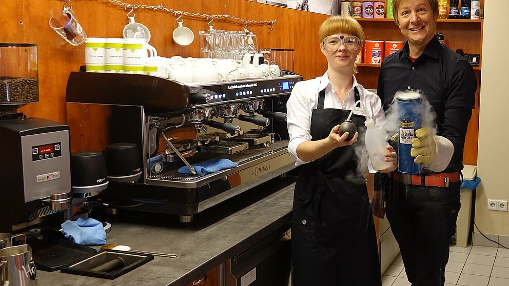 Foto: (Department Physik, Universität Paderborn) Jessica Thiele war so begeistert von der Aufzeichnung der RTL-Sendung, dass sie das „Sprengkugelexperiment“ zusammen mit Marc Sacher auch in der Café-Bar der Universität Paderborn nachstellte.