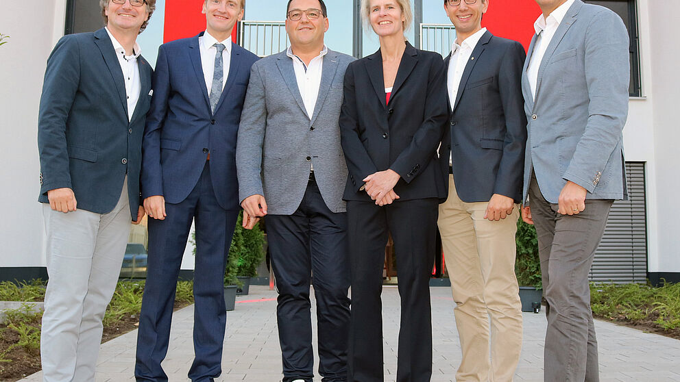 Foto (Universität Paderborn, Heiko Appelbaum): Feierten die Einweihung des neuen Gebäudes für LEONEX: v. l. Prof. Dr. Rüdiger Kabst, Stephan Winter, Thomas Gerlach, Anja Behrmann, Jürgen Wegener und Frank Wolters.