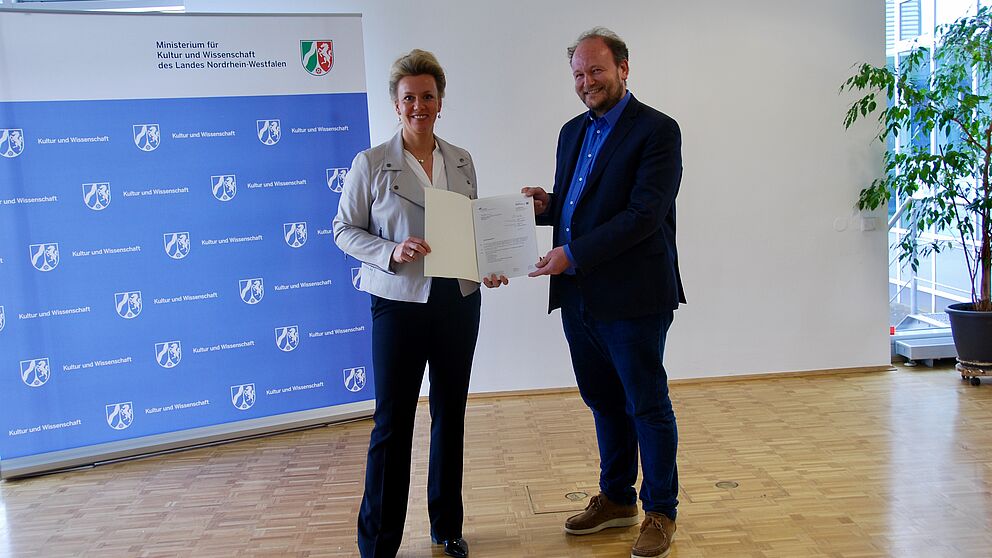 Foto (MKW): NRW-Wissenschaftsministerin Ina Brandes übergibt den Förderbescheid stellvertretend an Prof. Dr. Klaus von Stosch.