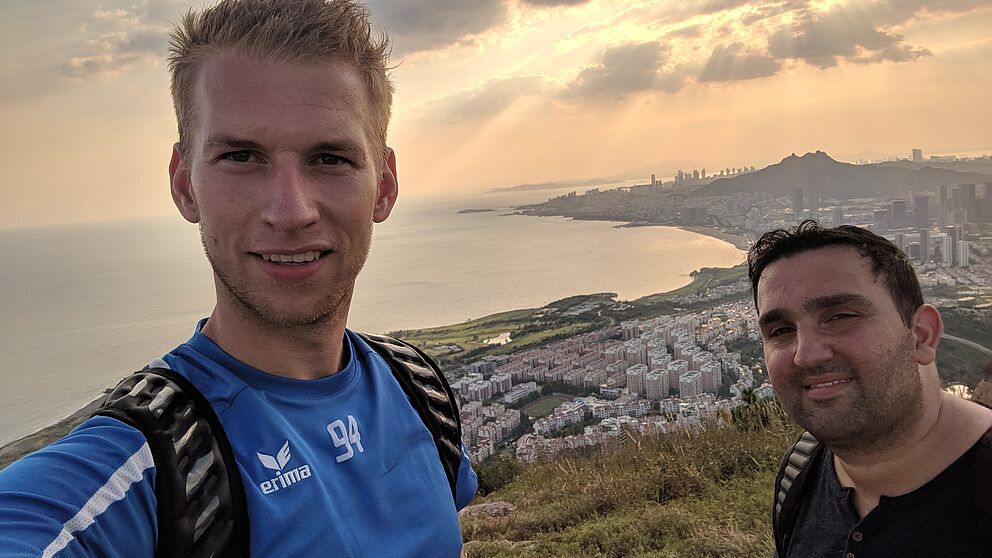 Foto (privat): V. l. Daniel Cramer und Ferhat Hammo während eines Ausflugs ins Fusan-Gebirge. Im Hintergrund liegen Qingdao und das Gelbe Meer.