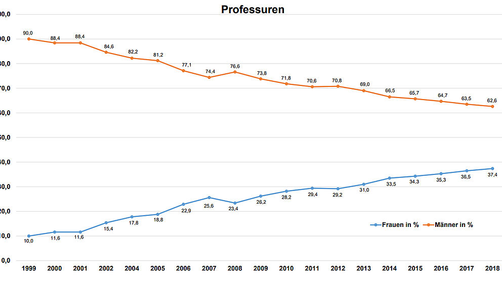 Grafik (Universität Paderborn): Bei dem Frauenanteil an den Professuren nimmt die Universität Paderborn seit vielen Jahren eine Spitzenposition im Landes- und Bundesvergleich ein.