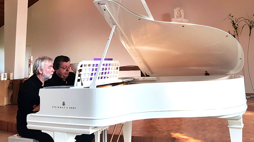 Foto (Harald Schroeter-Wittke): Prof. Dr. Harald Schroeter-Wittke (Universität Paderborn) und Berthold Wicke (Bonn) spielen vierhändig am Klavier.