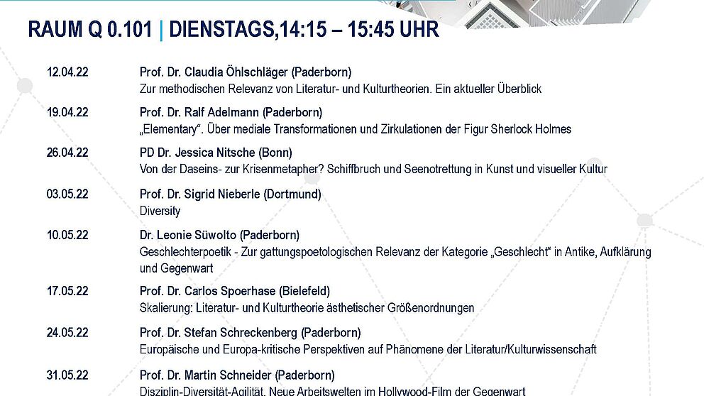 Im Sommersemester veranstaltet das Fach Komparatistik am Institut für Germanistik und Vergleichende Literaturwissenschaft der Universität Paderborn die Ringvorlesung „Literatur- und Kulturtheorien – komparatistisch und interdisziplinär“.