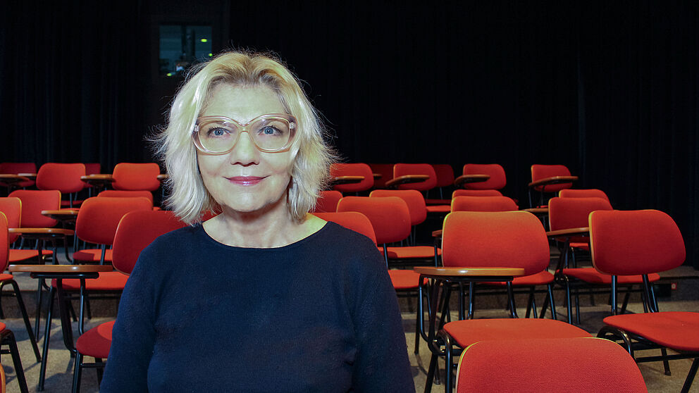 Foto (Universität Paderborn, Simon Ratmann): Prof. Dr. Annette Brauerhoch im Filmraum der Universität Paderborn.