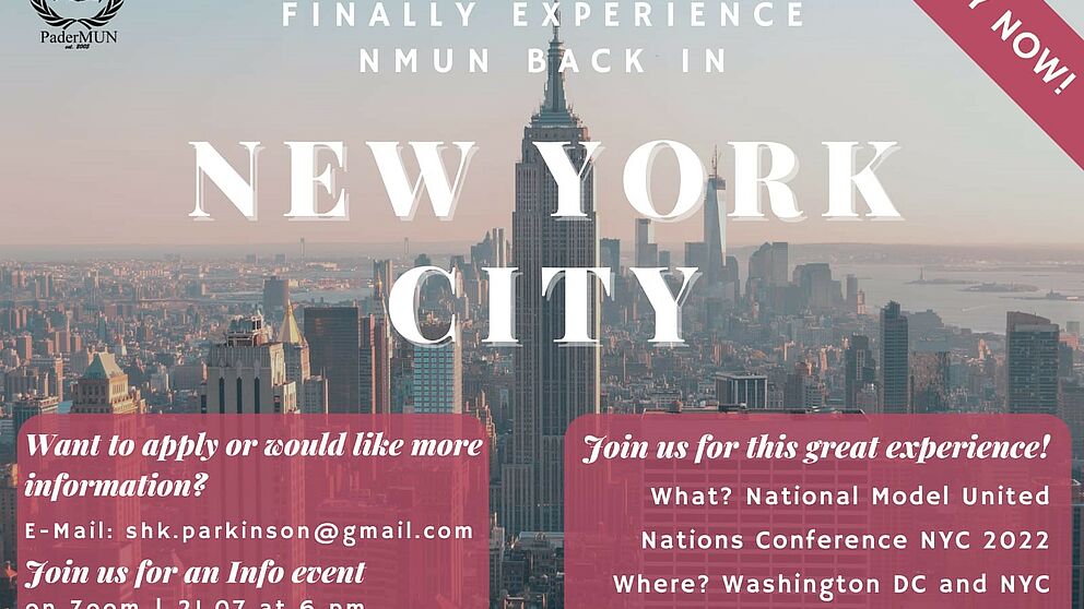 Es ist wieder so weit: Die Bewerbungsphase für die National Model United Nations Konferenz (NMUN) in New York hat begonnen. Studierende, die gerne einmal in die Rolle von Delegierten der Vereinten Nationen (UN) schlüpfen und die weltgrößte MUN in New York miterleben möchten, können sich noch bis zum 30. Juli bewerben.