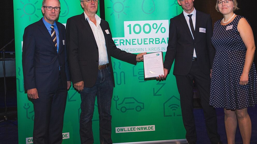 Foto (WestfalenWIND): Im Rahmen der 100% Ökostrom-Party übergab WestfalenWIND-Geschäftsführer Johannes Lackmann die Stiftungsurkunde an Uni-Vizepräsident Prof. Dr. Johannes Blömer. Landrat Manfred Müller (rechts) und Kerstin Haarmann vom LEE OWL freuen sich, dass das Kompetenzzentrum für Nachhaltige Energietechnik durch die Juniorprofessur gestärkt wird.