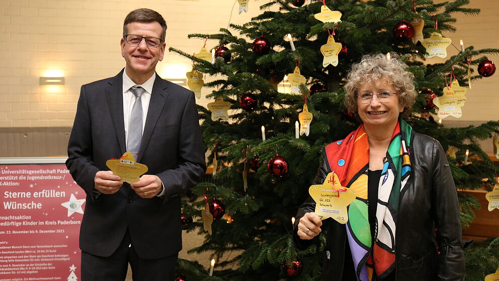 Foto (Universität Paderborn, Caroline Kloesel): Die Universitätsgesellschaft Paderborn hat in diesem Jahr die Jugendrotkreuz-Weihnachtsaktion für bedürftige Kinder im Kreis Paderborn unterstützt: (v. l.) Dr. Andreas Siebe und Heike Käferle, Vorstand Universitätsgesellschaft.