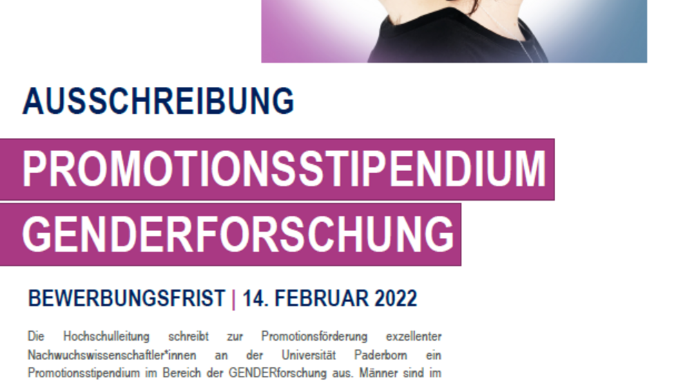 Die Hochschulleitung schreibt zur Promotionsförderung besonders qualifizierter wissenschaftlicher Nachwuchskräfte an der Universität Paderborn ein dreijähriges Promotionsstipendium im Bereich der Genderforschung aus.