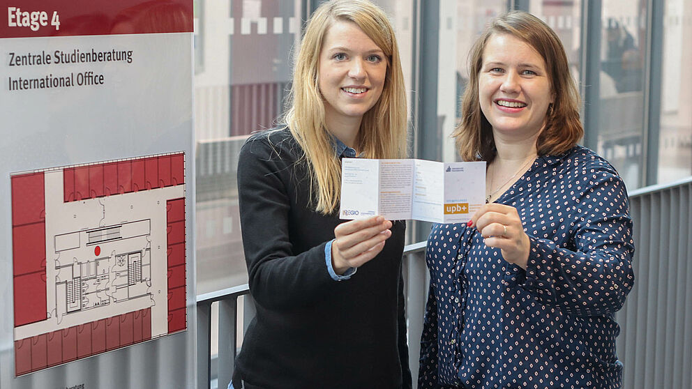Foto (Universität Paderborn, Cinderella Welz): V. l. Josephine Sames von der Zentralen Studienberatung und Simone Rudolph Brandão vom International Office präsentieren den upb+ Stempelpass“.