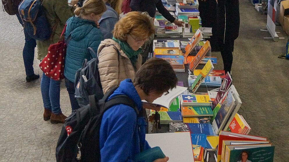 Foto (PLAZ, Björn Heerdegen): Die Buch- und Medienausstellung im Foyer lockte viele Besucher*innen an.