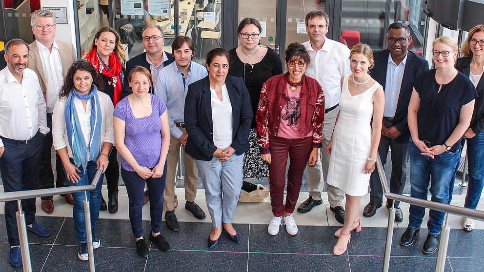 Foto (Universität Paderborn, Kamil Glabica): Planen eine "Europäische Hochschule": Prof. Dr. Torsten Meier, Vizepräsident für Internationale Beziehungen (hintere Reihe, Sechster v. l.), und Stefan Schwan, Leiter des International Office (hintere Reihe, Erster v. l.), mit Vertreterinnen und Vertretern der Hochschulen aus Frankreich, Spanien, Polen und Italien.