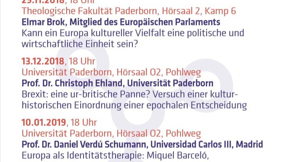 Am Donnerstag, 29. November, startet ein neues Format der Universität Paderborn: die „Paderborner Europa-Vorlesungen“. Elmar Brok, Mitglied des Europäischen Parlaments und Schirmherr der Vorlesungsreihe, hält den Eröffnungsvortrag. Er spricht zum Thema „Kann ein Europa kultureller Vielfalt eine politische und wirtschaftliche Einheit sein?“. Der Vortrag findet um 18 Uhr im Hörsaal 2 der Theologischen Fakultät Paderborn (Kamp 6) statt.…