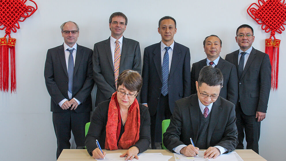 Foto 1 (Universität Paderborn, Kamil Glabica): Besiegelten die noch engere Kooperation zwischen ihren Hochschulen: V. l. Prof. Dr. Birgitt Riegraf, Präsidentin der Universität Paderborn, und Prof. Dr. Yang Zongkai, Präsident der Xidian-Universität, beim Unterzeichnen des Abkommens.