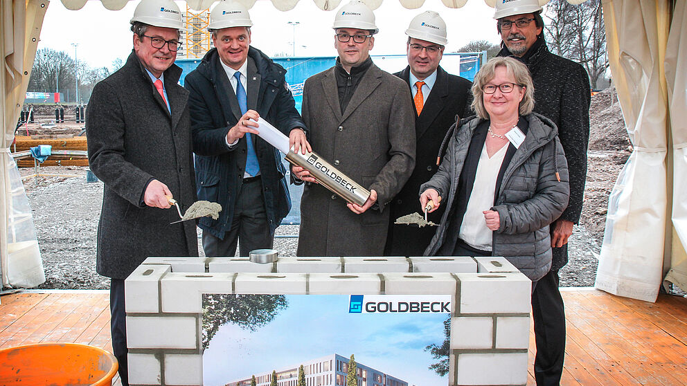 Foto (Universität Paderborn, Kamil Glabica): Freuen sich über die Grundsteinlegung: v. l. Michael Dreier (Bürgermeister der Stadt Paderborn), Jörg Timmermann (Vorstandssprecher der Weidmüller Gruppe), Carsten Hense (Geschäftsbereichsleiter GOLDBECK Public Partner GmbH), Prof. Dr. Ansgar Trächtler (Institutsleiter Fraunhofer IEM), Simone Probst (Vizepräsidentin für Personal- und Wirtschaftsverwaltung der Universität Paderborn) und Prof. Dr. Gregor Engels (Vorstandsvorsitzender im SICP).