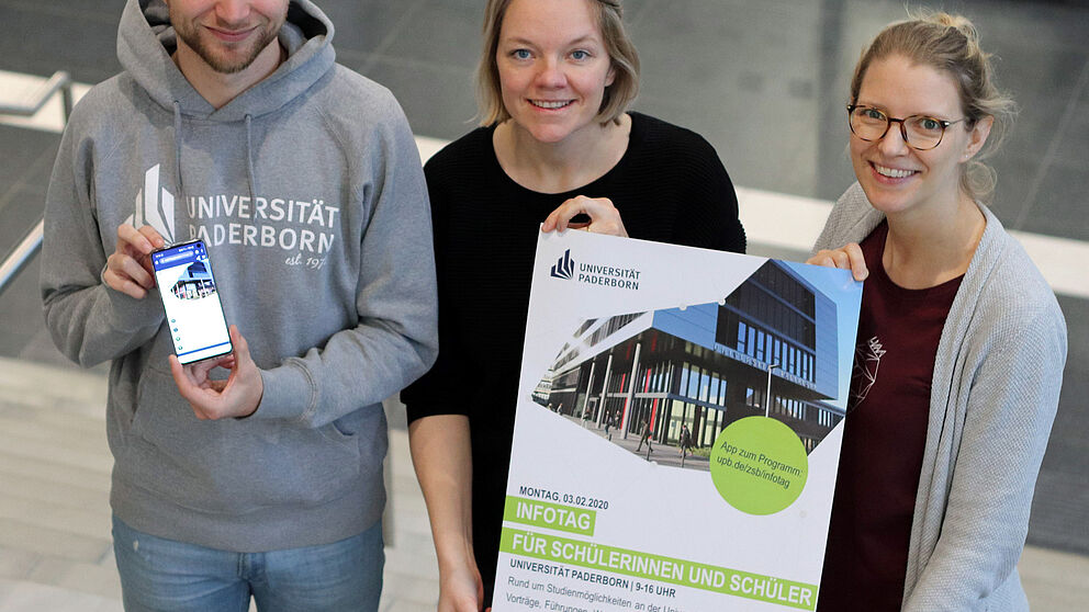 Foto (Universität Paderborn, Alina Henkel): V.l.: Philipp Schneider, Cinderella Welz und Kirsten Bondzio von der Zentralen Studienberatung laden zum „Infotag für Schülerinnen und Schüler“ am 3. Februar ein.
