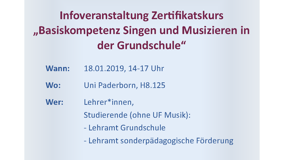 Am Freitag, 18. Januar 2019, findet von 14 bis 17 Uhr im Raum H8.125 eine Infoveranstaltung zum Zertifikatskurs "Basiskompetenz Singen und Musizieren in der Grundschule" statt. Das Angebot richtet sich an Lehrkräfte und Studierende (Grundschule und sonderpädagogische Förderung) ohne das Unterrichtsfach Musik.