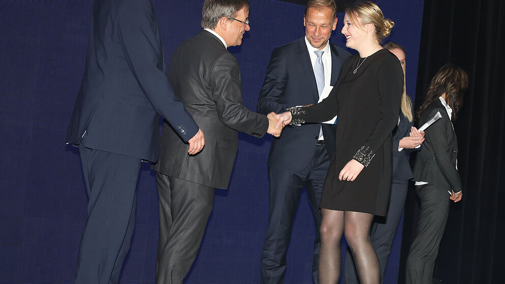 Foto (Olaf-Wull-Nickel/Nickel Photography): Ministerpräsident Armin Laschet gratuliert Lisa Kaup von der Universität Paderborn zum exzellenten Ausbildungsabschluss.