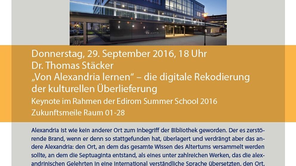 Am 29. September informiert Dr. Thomas Stäcker über das Thema „Von Alexandria lernen – die digitale Rekodierung der kulturellen Überlieferung.“ Der Vortrag findet im Rahmen der Edirom Summer School 2016 statt.