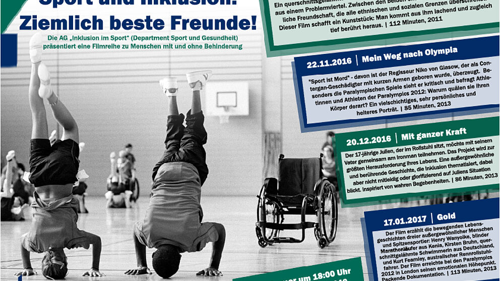Die Arbeitsgruppe "Inklusion im Sport" am Department Sport & Gesundheit, unter der Leitung von Prof. Dr. Sabine Radtke, präsentiert in diesem Wintersemester für Studierende und alle anderen Angehörige der Universität Paderborn die Filmreihe "Sport und Inklusion: Ziemlich beste Freunde".