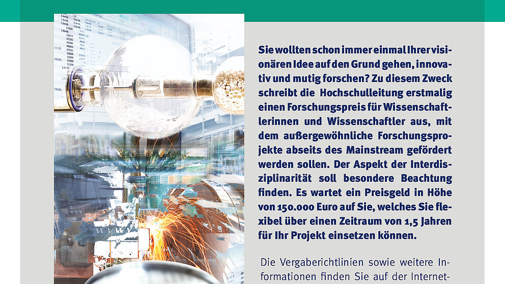 Die Hochschulleitung schreibt einen Forschungspreis für Wissenschaftlerinnen und Wissenschaftler aus, mit dem außergewöhnliche Forschungsprojekte abseits des Mainstreams gefördert werden sollen.