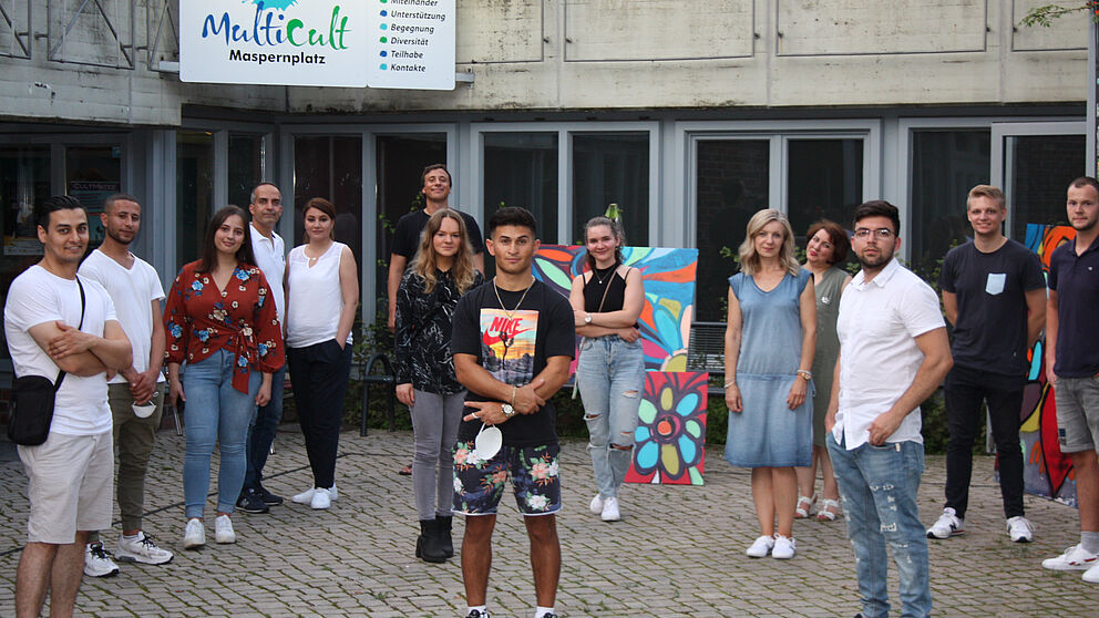 Foto (Uni Paderborn): Studentische Sprachbegleiter*innen und ihre Sprachschüler*innen sowie das Betreuer*innenteam beim Abschlusstreffen am 20. August.