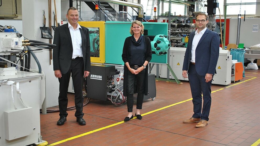 Foto (Universität Paderborn): Prof. Dr. Elmar Moritzer (links) und Dr. Matthias Hopp informieren Regierungspräsidentin Judith Pirscher über die Idee zu einem JRF-Forschungsinstitut für Kunststoffrecycling in Paderborn.