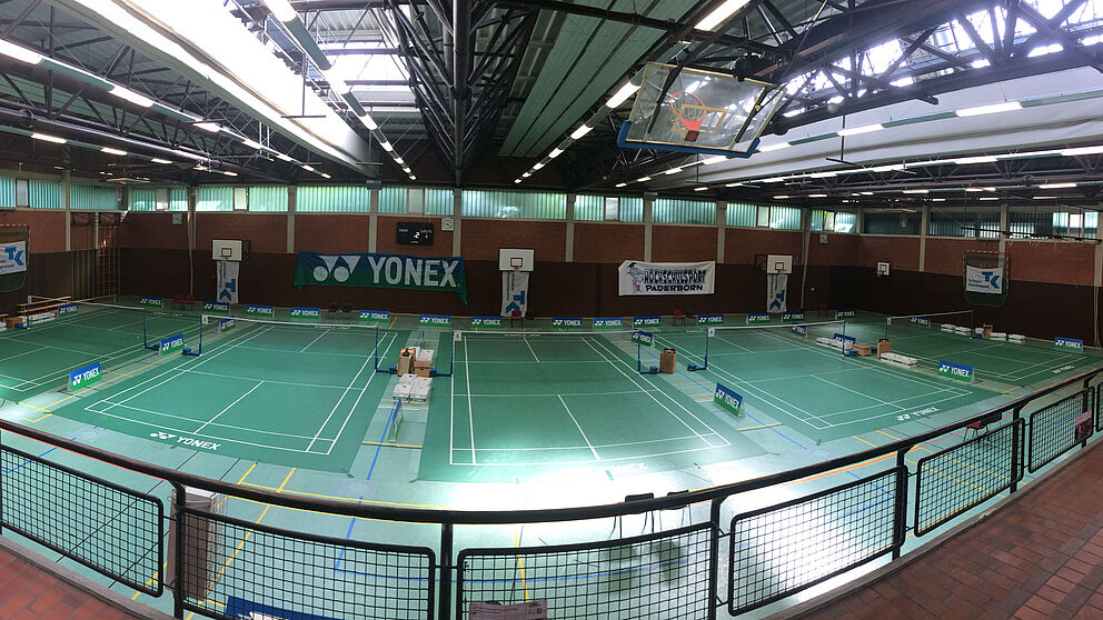 Foto (Kim Buss): Die Sporthalle der Universität Paderborn ist erneut Austragungsort der Deutschen Hochschulmeisterschaften im Badminton.
