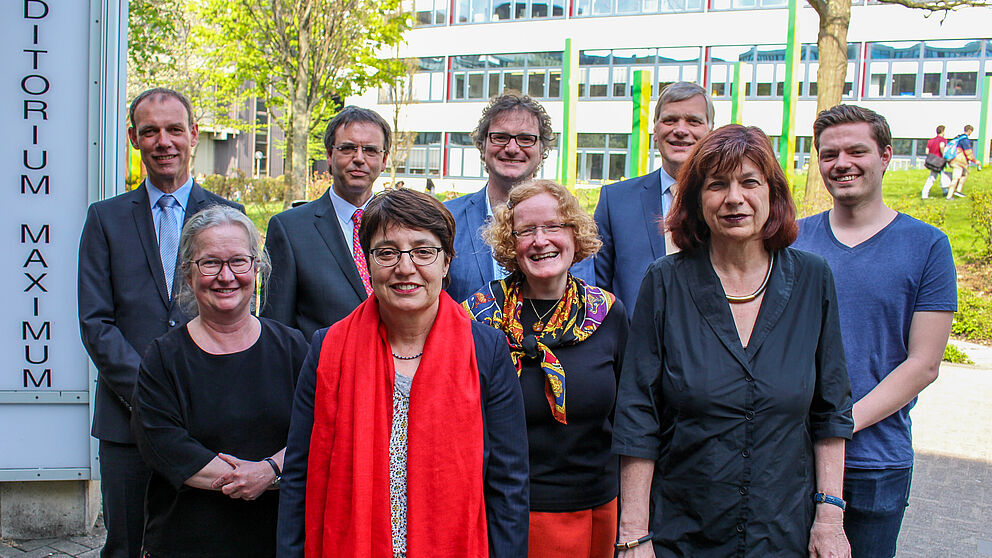 Foto (Universität Paderborn, Johannes Pauly): (v. l.) Prof. Dr. Johannes Blömer, Simone Probst, Prof Dr. Torsten Meier, Prof. Dr. Birgitt Riegraf, Prof. Dr. Rüdiger Kabst, Prof. Dr. Merle Tönnies, Prof. Dr.-Ing. Volker Schöppner, Dr. Dagmar Simon und Julius Erdmann.