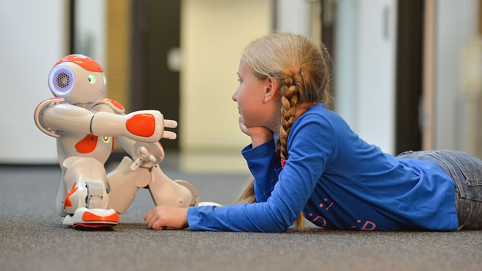 Foto (CITEC, Universität Bielefeld): Beim Projekt „merits“ geht es um frühkindlichen Medienumgang und Sprachlernen mit Robotern.