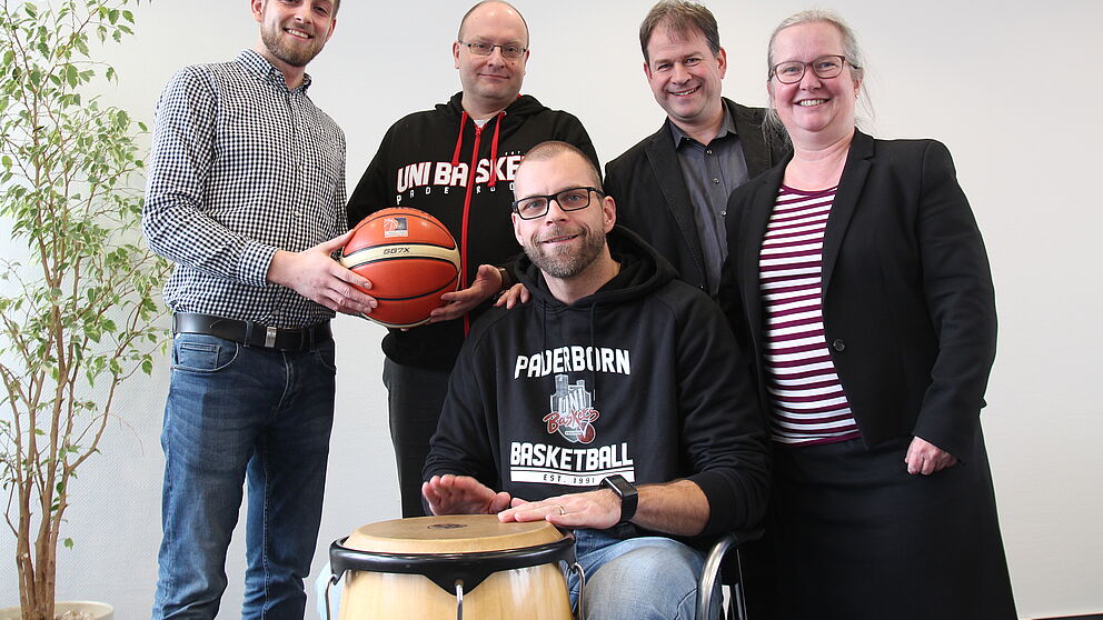 Foto (Universität Paderborn, Nina Reckendorf): (V.l.n.r.) Geschäftsstellenleiter Marco Striewe, Steffen Schiel, Leiter vom Hochschulorchester, Uli Lettermann und Simone Probst haben sich um den an der Trommel sitzenden Coach Uli Naechster versammelt.