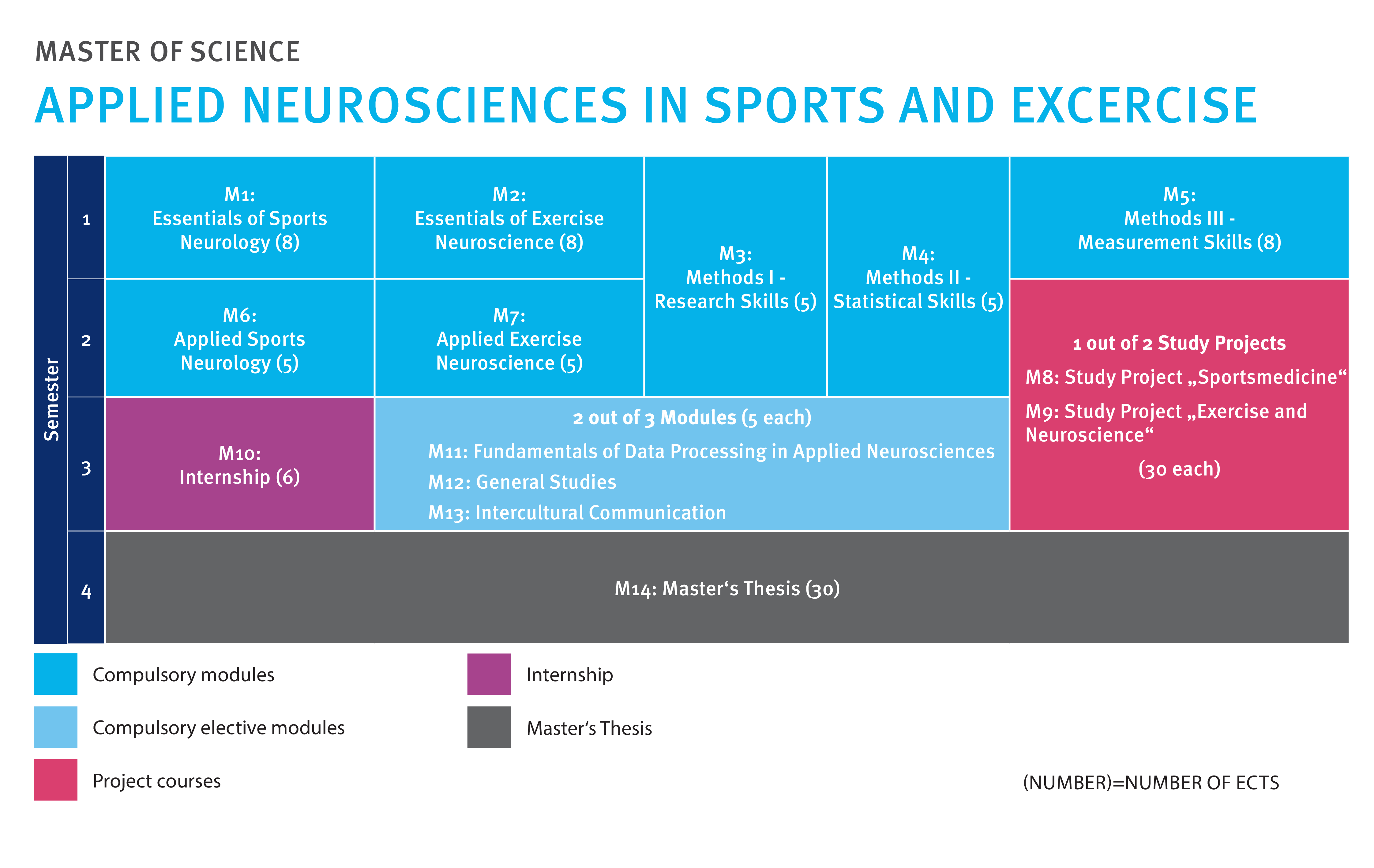 Der Masterstudiengang "Applied Neurosciences in Sports & Exercise" zielt darauf ab, Experten auszubilden, die die Auswirkungen der Neurowissenschaften in Verbindung mit Sport und Bewegung aufzeigen. Das Lehrprogramm im Master of Science hat einen starken wissenschaftlichen Schwerpunkt. Gleichzeitig werden, wie das "Applied" im Titel des Studiengangs verdeutlicht, alle Inhalte auf die reale Welt bezogen und in anwendungsorientierten Lernarrangements mit "echten Menschen" (d.h. Patienten, Freizeit- oder Profisportlern, älteren und jüngeren Menschen, Schülern, Studenten und Berufstätigen) umgesetzt.