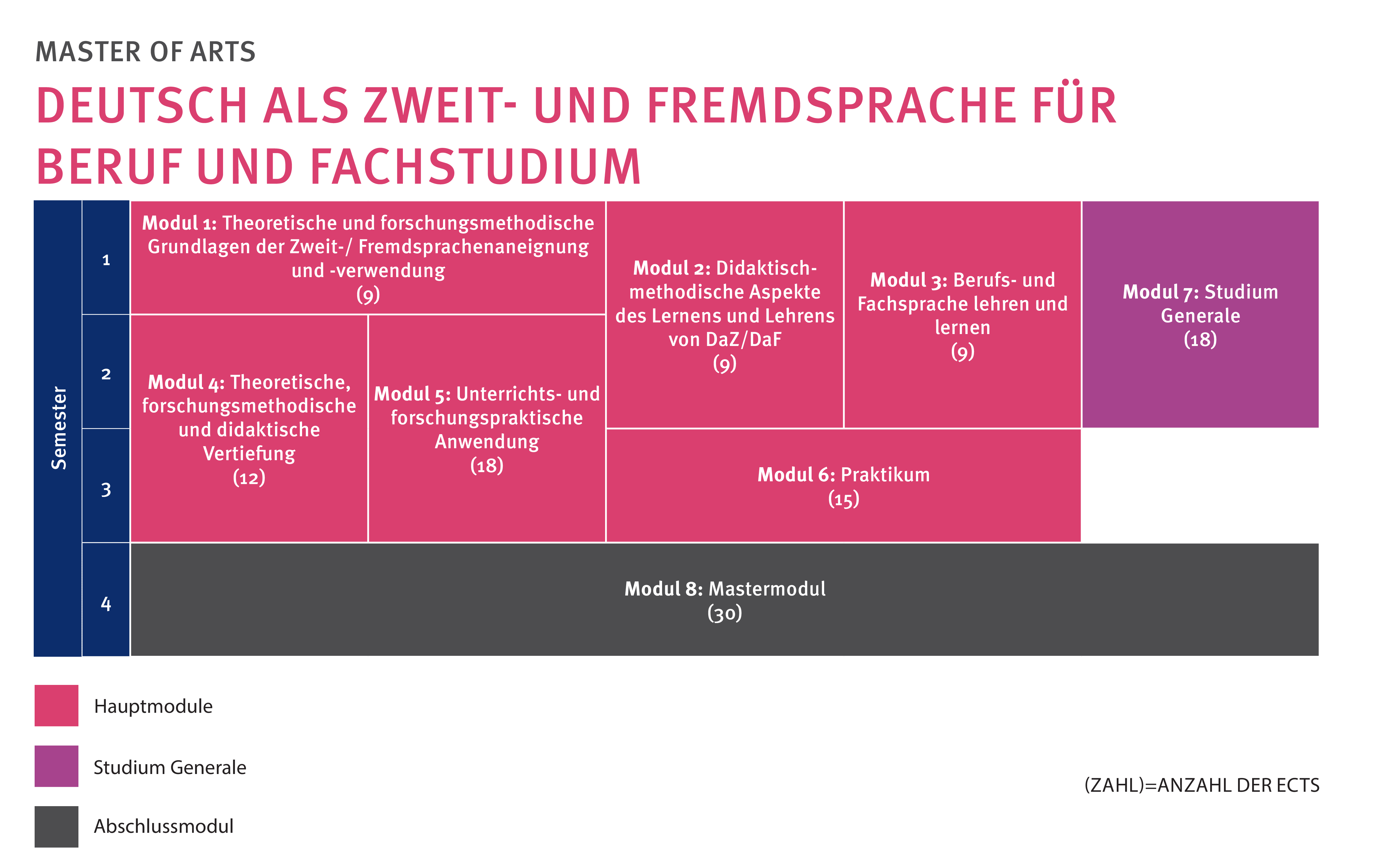 In Zeiten der Globalisierung und zunehmender transnationaler Migration haben Forschung und Lehre im Fach Deutsch als Zweit- und Fremdsprache (DaZ/DaF) eine große gesellschaftliche Bedeutung. Sprachen und Sprachkompetenzen spielen für Teilhabe an gesellschaftlichen Praktiken und Diskursen, beruflicher Bildung, Studium und Erwerbsarbeit eine zentrale Rolle. Durch (Flucht-)Migration, die gezielte Anwerbung von internationalen Fachkräften sowie durch die Internationalisierung der Hochschulen werden das Lehren und Lernen des Deutschen als Zweit- und Fremdsprache immer wichtiger. Auch im Ausland lernen ca. 15 Mio. Menschen Deutsch, besonders an Schulen und im Kontext von Studium und Beruf. Vor diesem Hintergrund befasst sich der Studiengang mit der Professionalisierung der Studierenden für das Lehren und Erforschen des Deutschen als Zweit- und Fremdsprache – insbesondere für den Beruf und das Fachstudium – in institutionellen und außerinstitutionellen Kontexten unter den Bedingungen von Mehrsprachigkeit.