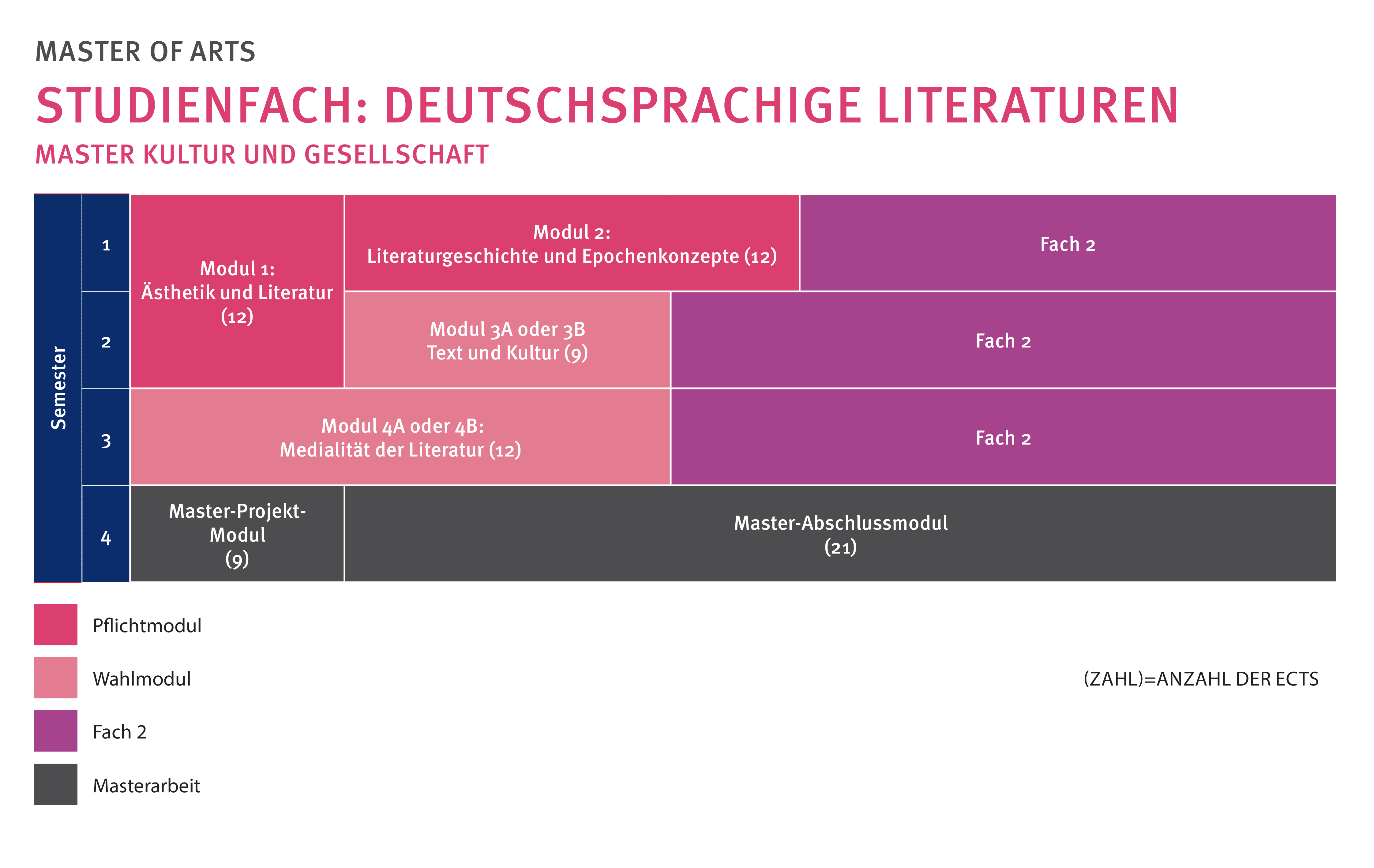 Das Studium des Fachs Deutschsprachige Literaturen gliedert sich in vier Module. Die Module 1 und 2 bilden den Eingangsbereich, die Module 3 und 4 den Vertiefungsbereich: