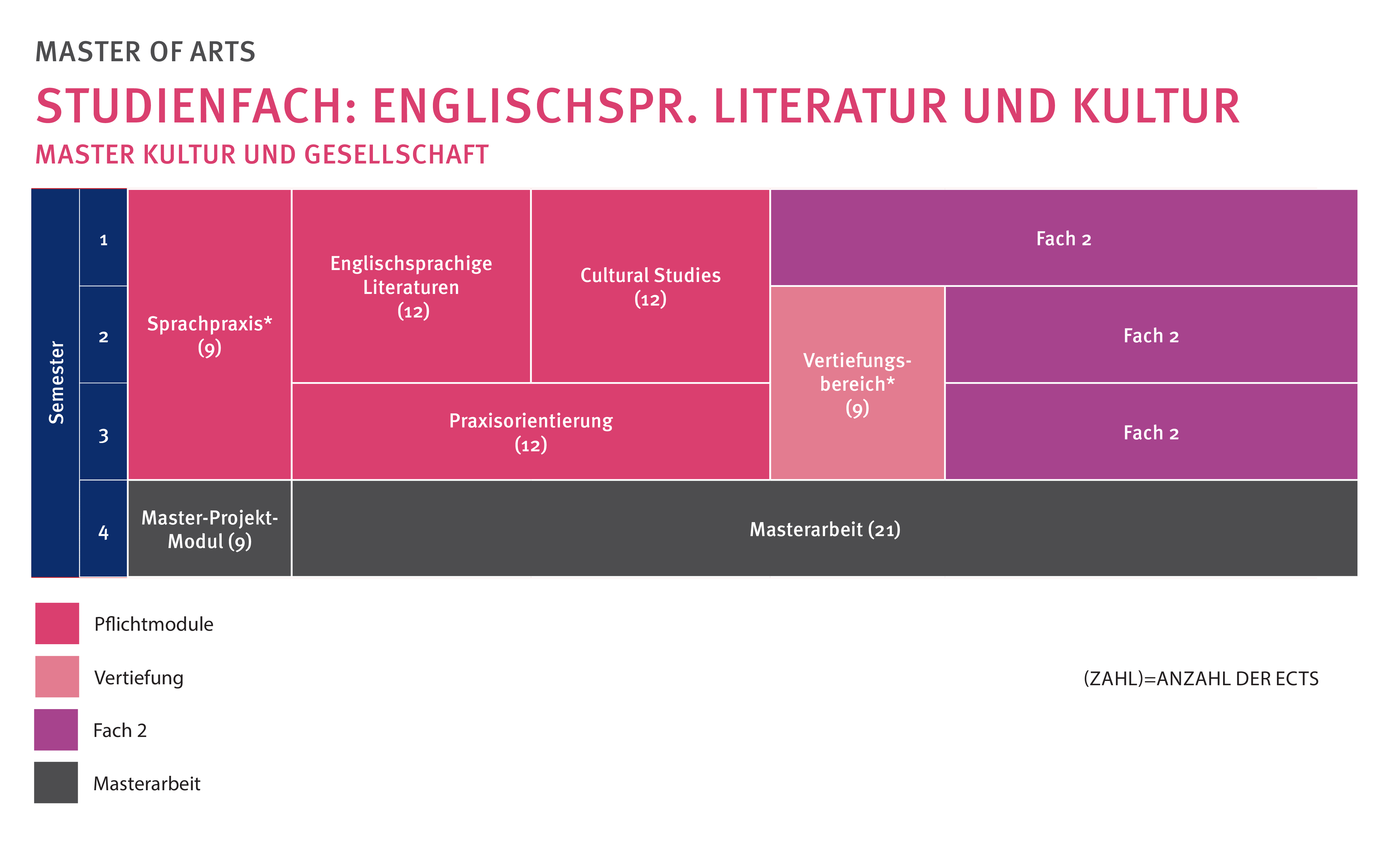 Das Fach Englischsprachige Literatur und Kultur besteht aus vier thematischen bzw. praxisorientierten Modulen. Du kannst selbst über die Abfolge der einzelnen Elemente Ihres Studiums entscheiden, wobei es dir einige Empfehlungen erlauben, den bestmöglichen Studienerfolg zu erreichen: Die drei Kurse des Sprachpraxismoduls (1) solltest du über drei Semester verteilen, um die kontinuierliche Entwicklung Ihrer englischen Sprachkompetenz sicherzustellen.