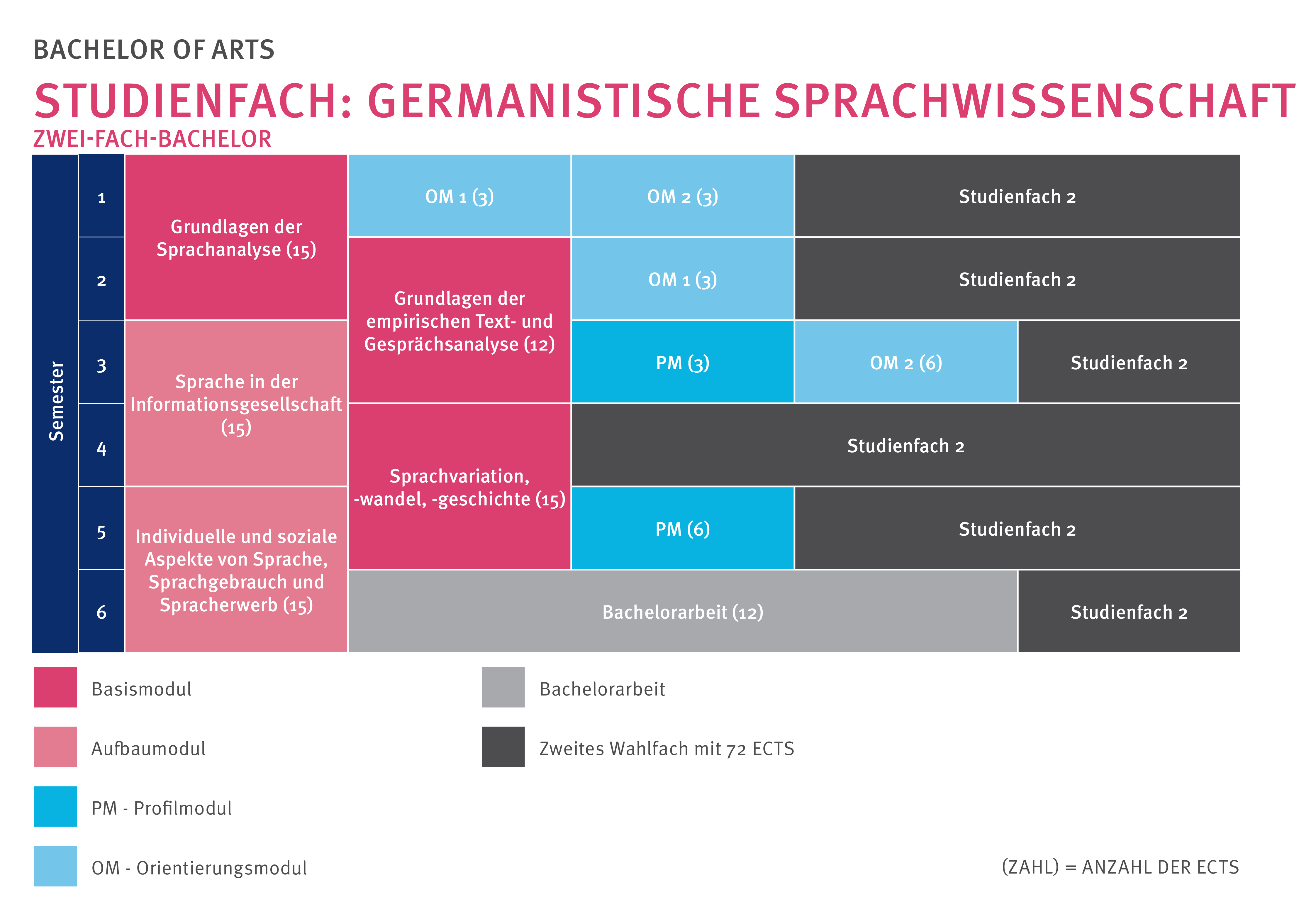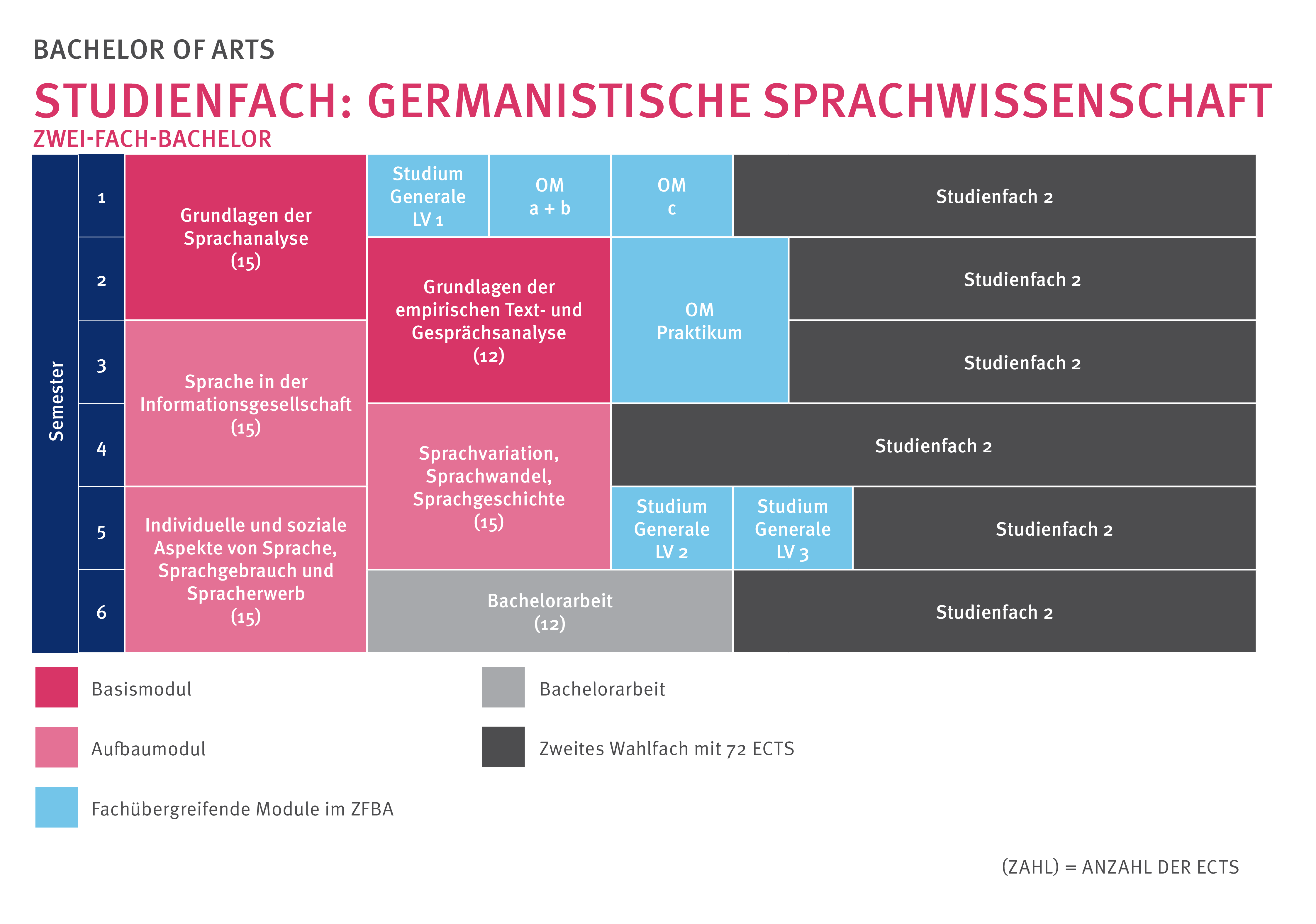 Im Rahmen des Zwei-Fach-Bachelors werden zwei Fächer gleichwertig studiert. Du musst also das Fach "Germanistische Sprachwissenschaft" mit einem weiteren Fach kombinieren. Auf der Webseite des Zwei-Fach-Bachelors Kulturwissenschaften findest du allgemeine Informationen zum Studiengang, zur Fächerübersicht und zu den Kombinationsmöglichkeiten.