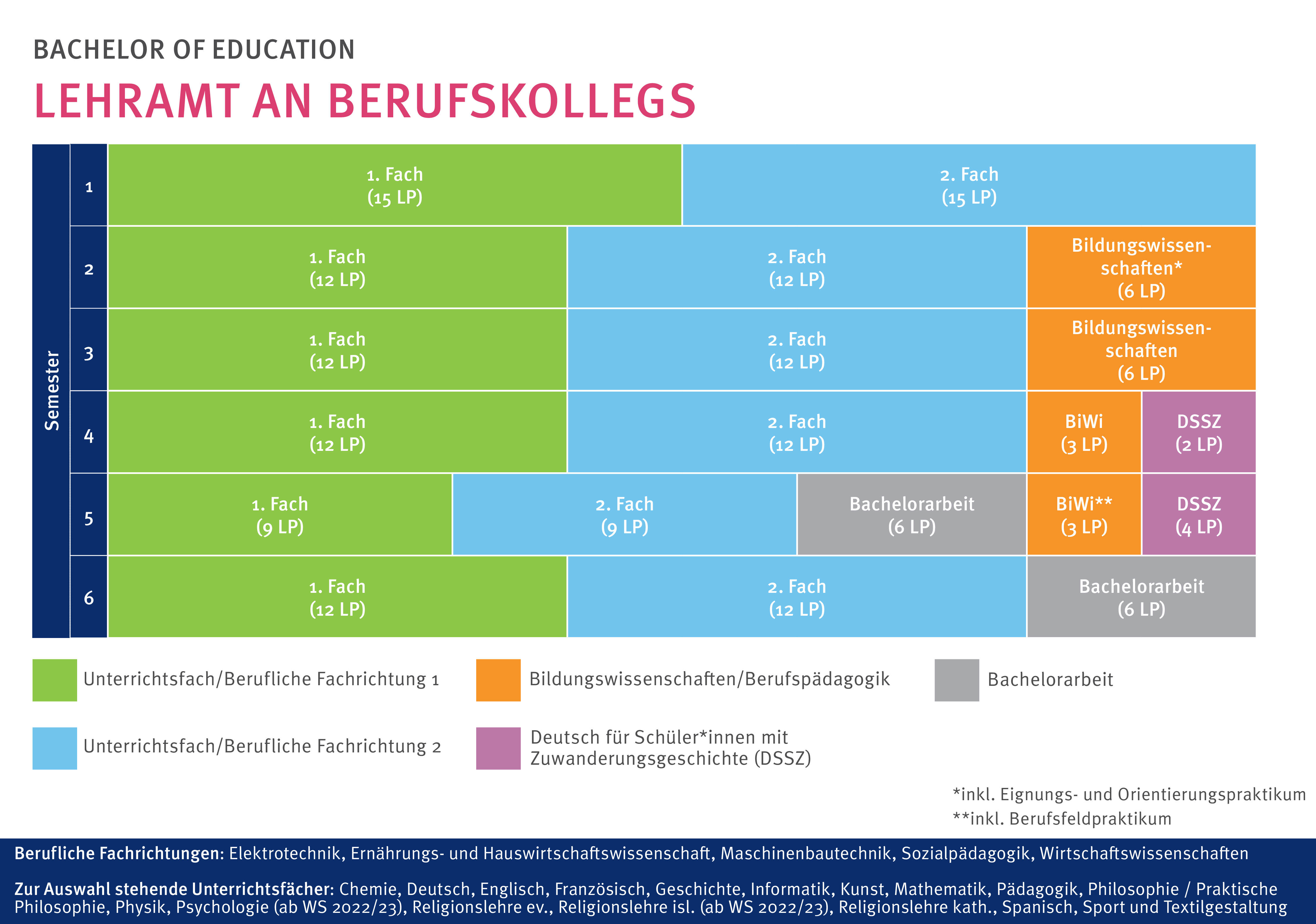 Im Rahmen des Studiums sind zwei Fächer bzw. berufliche Fachrichtungen gleichwertig zu studieren. Bildungswissenschaften sind integraler Bestandteil des Studiums; es ist keine gesonderte Bewerbung bzw. Einschreibung erforderlich.