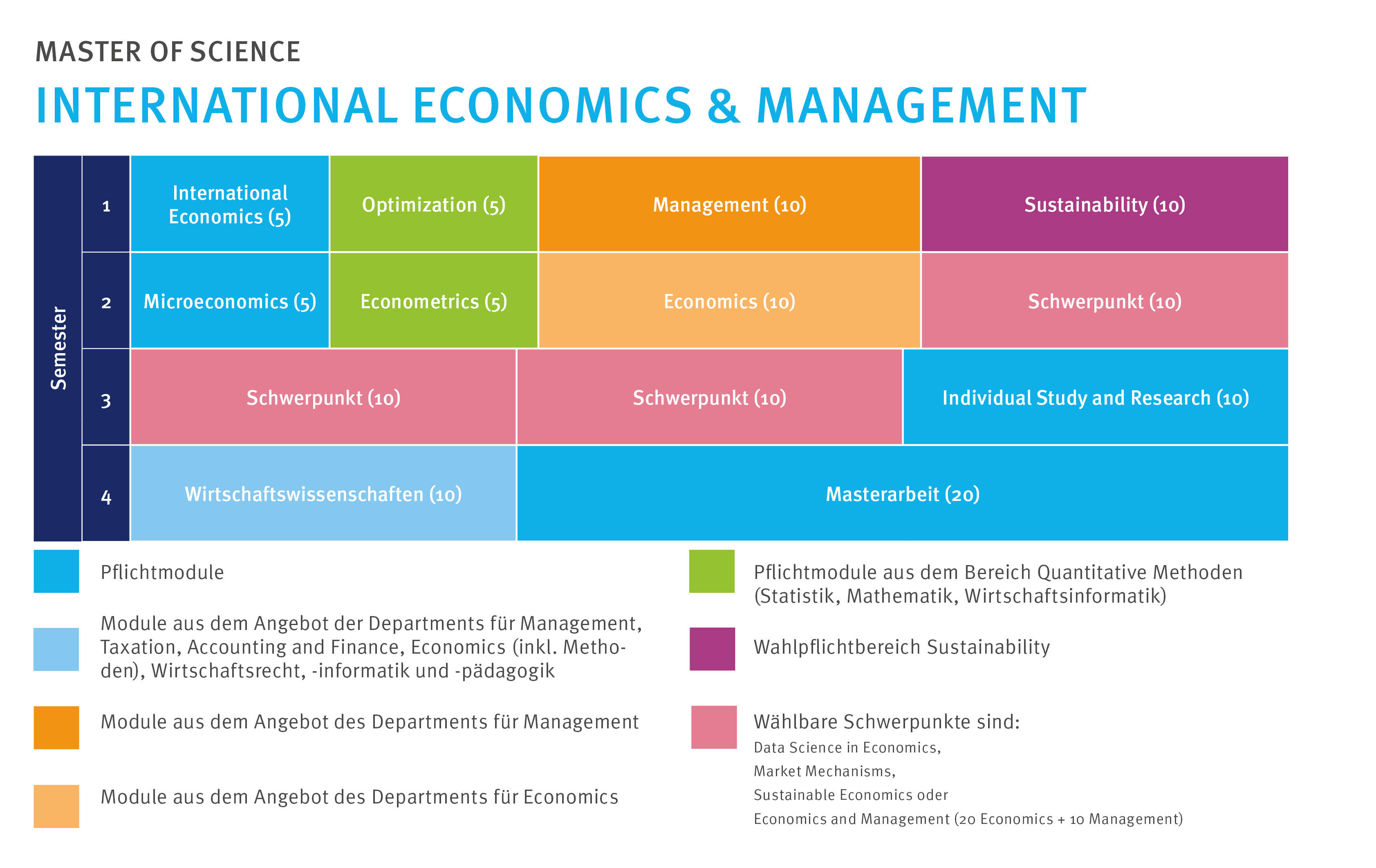 Der Masterstudiengang International Economics and Management deckt ein breites fachliches Spektrum ab und eröffnet die Möglichkeit für verschiedenste international ausgerichtete Berufswege. Um mögliche Profilierungen nach außen sichtbar zu machen, kannst du informelle Schwerpunkte studieren und auf dem Abschlusszeugnis ausweisen lassen. Zum Ausweis eines Schwerpunktes ist es notwendig, Module im Umfang von 30 ECTS aus dem Schwerpunkt zu bestehen sowie eine schwerpunktspezifische Abschlussarbeit zu verfassen.